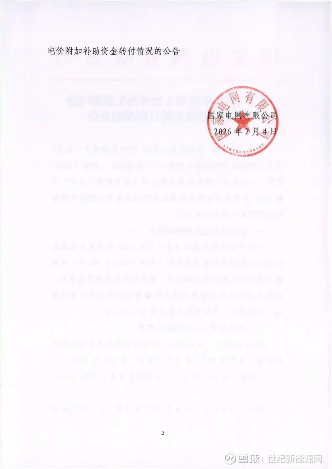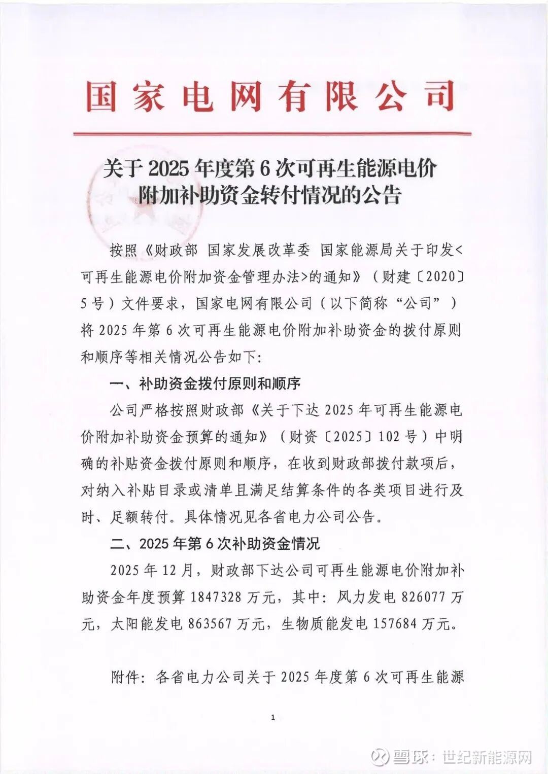 2月24日,国网新能源云发布国家电网有限公司关于2025年度第六次可再生能源附加补助资金转付情况的公告,总金额为1847328万元。