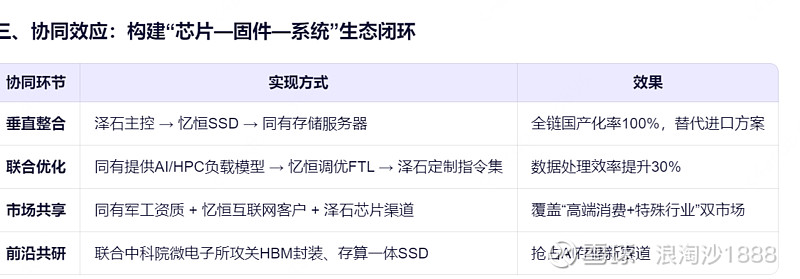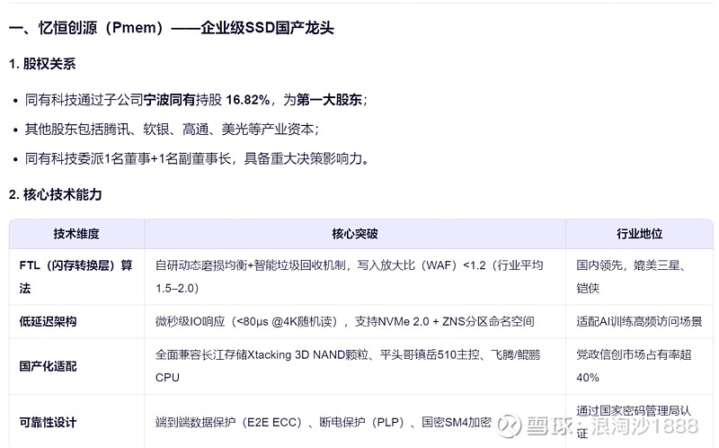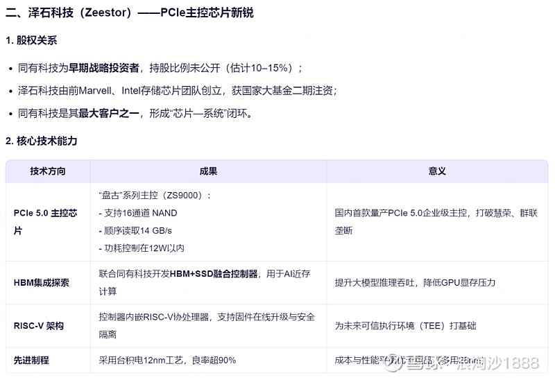 同有一直深耕存储领域,通过自主研发和并购入股两条路,投资忆恒创源(企业级SSD)、泽石科技(PCIe5.0主控芯片)、全资并购鸿秦科技(军工SSD),形成 “芯片—部件—系统”全栈能力,强化自主可控壁垒。