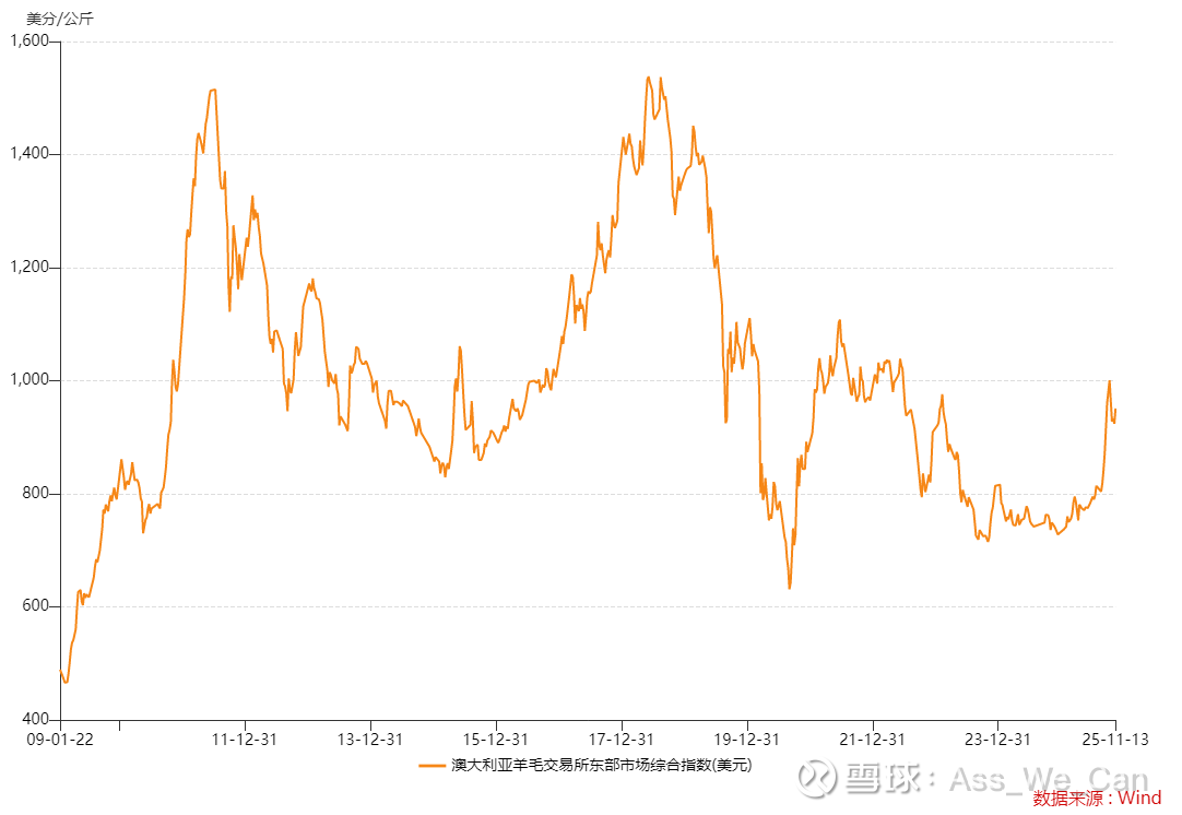 在尚未充分理解羊毛价格周期的情况下,只能跟踪澳毛的拍卖情况,如果真的形成供给反转,羊毛供应1-2年内难以恢复(一只羊养到半年才能出毛,更别提前面的怀孕生产周期),可能这次的羊毛价格会持续上涨到超越历史前高的水平。澳洲一年有几次较大的羊毛拍卖,下次应该是明年年后,重点关注那次的拍卖数据比较能反映实际的价格趋势