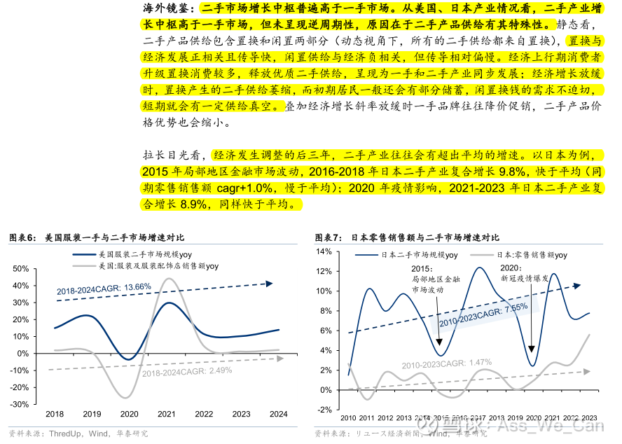 · 经济好的时候,大家置换频繁,二手回收增速会加速,是量增逻辑;经济不好时,置换降低,短期可能会有些真空期,但是经济调整的后三年,往往二手产业会超出平均行业的增速,大家存款不多了,置换意愿提升了,渗透率就提升——我国现在就是从一个经济不好逐步往向好的过程中发展,后面的需求反而可能更强