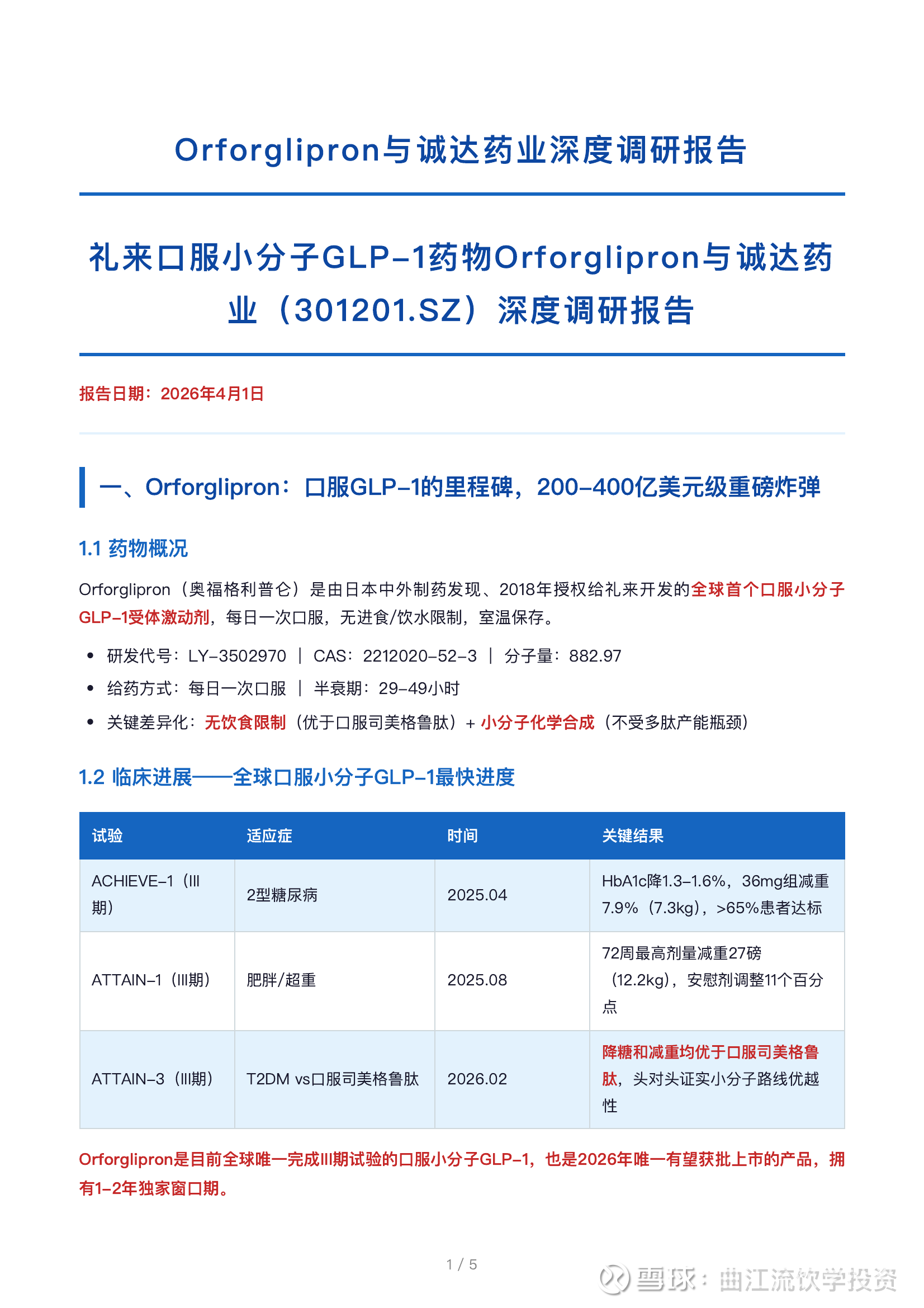 Orforglipron是目前全球唯一完成III期试验的口服小分子GLP-1,也是2026年唯一有望获批上市的产品,拥有1-2年独家窗口期。