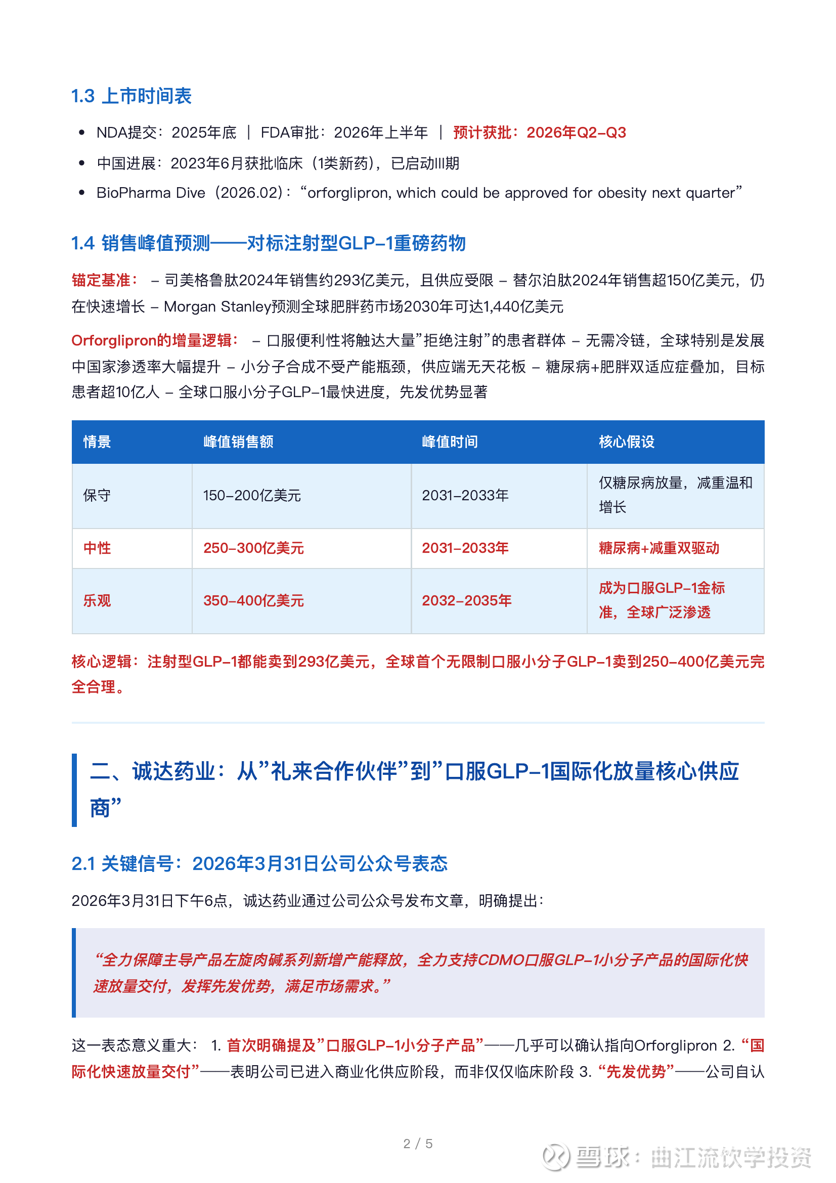 核心结论:仅Orforglipron一个品种,就可能使诚达药业的收入体量增长3-5倍。叠加左旋肉碱新产能释放,公司有望从小型CDMO跃升为中型制药服务平台。