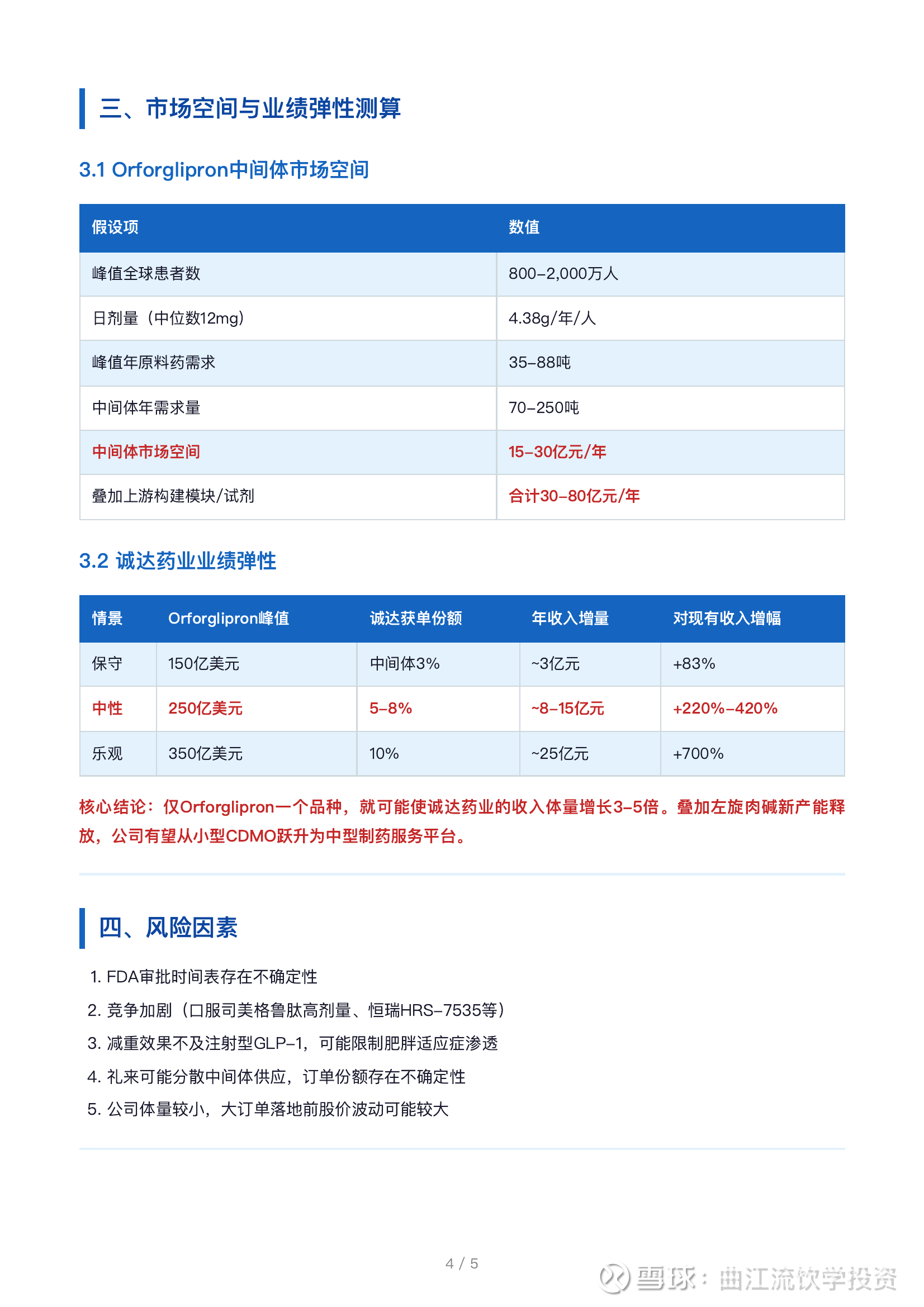▸ 保守:Orforglipron峰值150亿美元,诚达获中间体3%份额 → 年收入增量~3亿元 → 对现有收入增幅+83%
