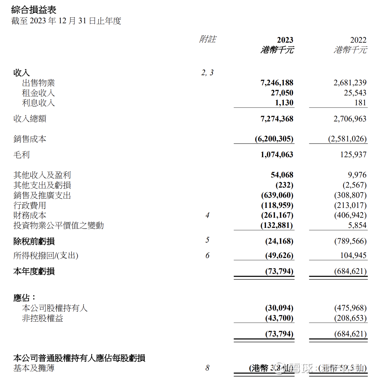 乐居财经 徐迪3月27日,渝太地产(00075.HK)发布业绩公告。2023年总收入为72.74亿港元,同比增加168.7%;股东应占亏损3009.4万港元,较2022年的亏损金额收窄93.68%。