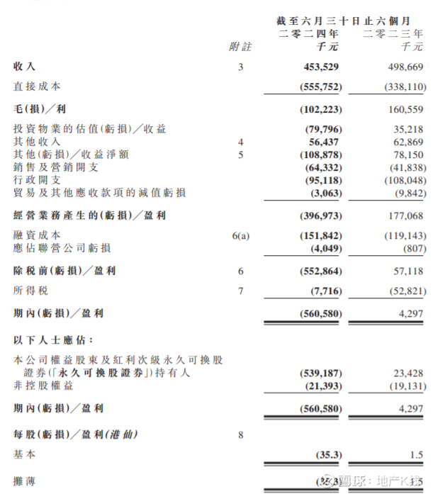 截至2024年6月30日止6个月,公司权益股东及红利永久次级可换股证券持有人应占亏损约为539,200,000港元(截至2023年6月30日止6个月:溢利约23,400,000港元)。