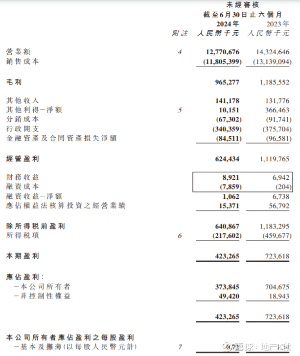 截至2024年6月30日止六个月,集团实现营业额约127.71亿元,较去年同期下降约11%,营业额的减少主要是由于期内房地产开发业务确认收入较去年同期有所减少;经营盈利约6.24亿元,较去年同期大幅下降约44%;公司所有者应占盈利约3.74亿元,较去年同期大幅下降约47%;每股盈利约0.72元,较去年同期大幅下降约46%。