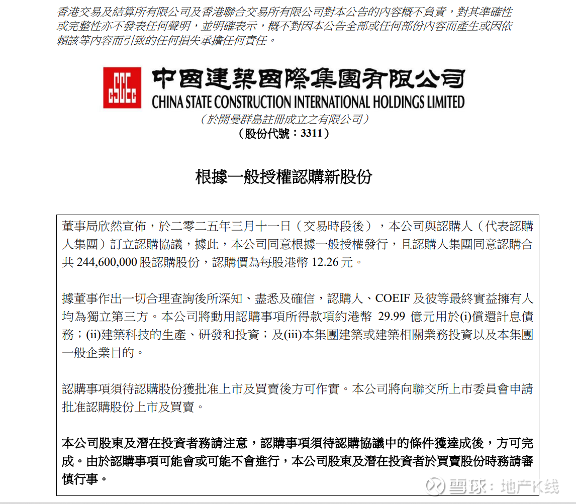 乐居财经 赵盼盼3月11日,中国建筑国际集团有限公司发布公告,根据一般授权,公司与认购人中国东方资产管理(国际)控股有限公司订立认购协议,认购约2.446亿股新股份,认购价为每股12.26港元,总认购价达到29.99亿港元。