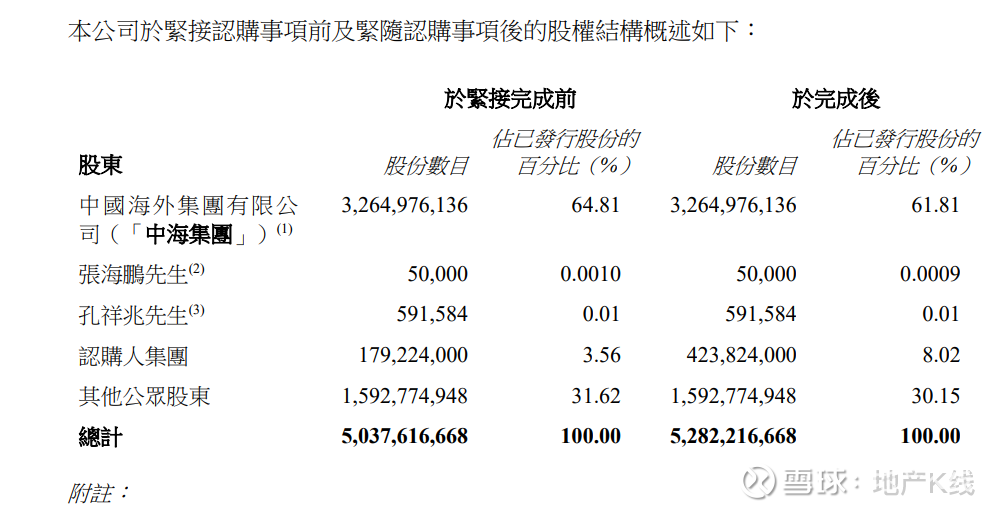 认购完成后,中国建筑国际集团有限公司股东中国海外集团有限公司持股比例由64.81%降至61.81%,认购人集团持股比例由3.56%增至8.02%,其他公众股东持股比例由31.62%降至30.15%。