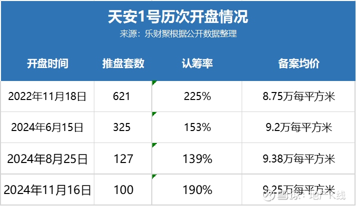 实际上,天安1号之所以敢于大幅涨价,底层逻辑还在于火热的销售情况,过去四次开盘认筹率介于139-225%之间。