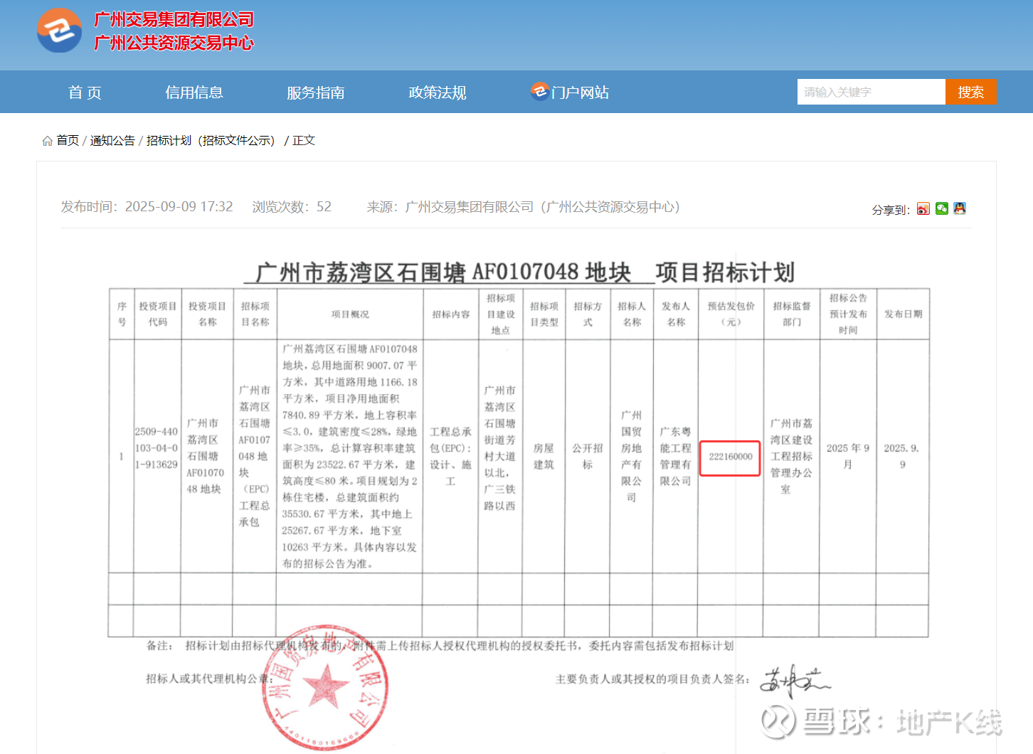 9月9日,广州公共资源交易中心发布了该地块项目招标计划。招标内容为工程总承包(EPC),包含设计、施工,预估发包价为2.2216亿元。