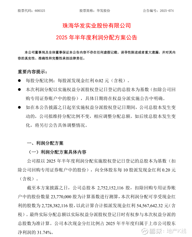 依托正向盈利,华发股份响应国家政策,大方派息,与投资者共享公司发展成果。年中向全体股东每股现金分红0.02元(含税),分红比例达31.72%,在房地产行业调整期以真金白银回馈投资者,助力提振市场信心。