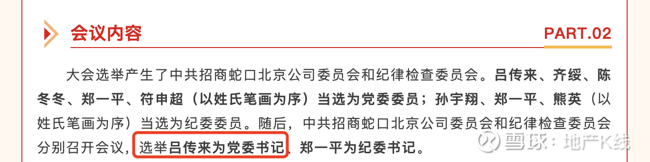 吕传来、齐绥、陈冬冬、郑一平、符申超当选为党委委员;孙宇翔、郑一平、熊英当选为纪委委员。随后,中共招商蛇口北京公司委员会和纪律检查委员会分别召开会议,选举吕传来为党委书记、郑一平为纪委书记。