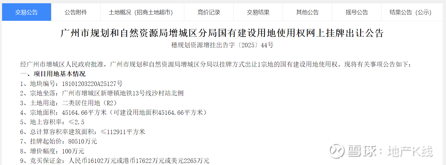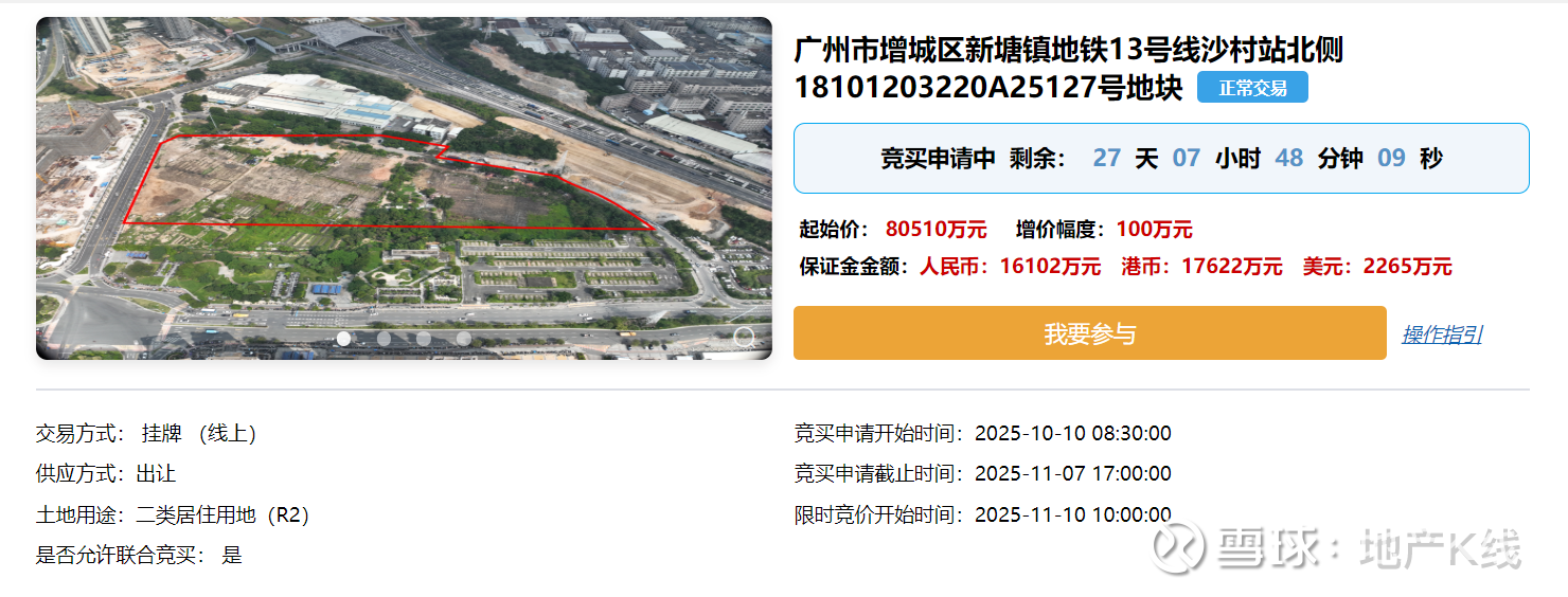 粤进深 赵盼盼 10月10日,据广州市规划和自然资源局,增城区新塘镇地铁13号线沙村站北侧18101203220A25127号地块挂牌,拟于11月10日10时进行限时竞价。