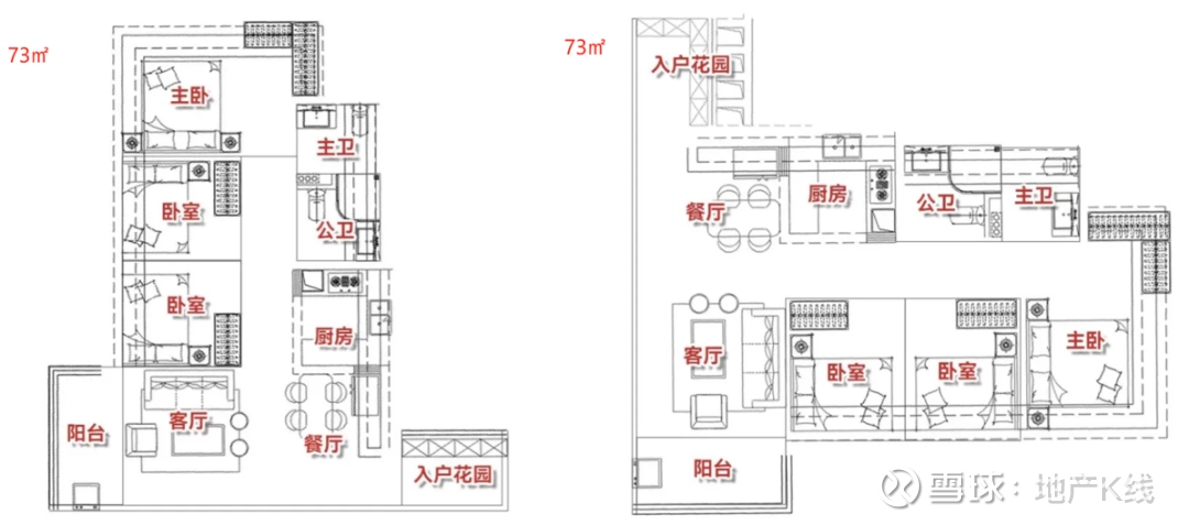 73㎡的户型,有入户花园,三个卧室;四开间朝南,主卧还是独立卫生间。
