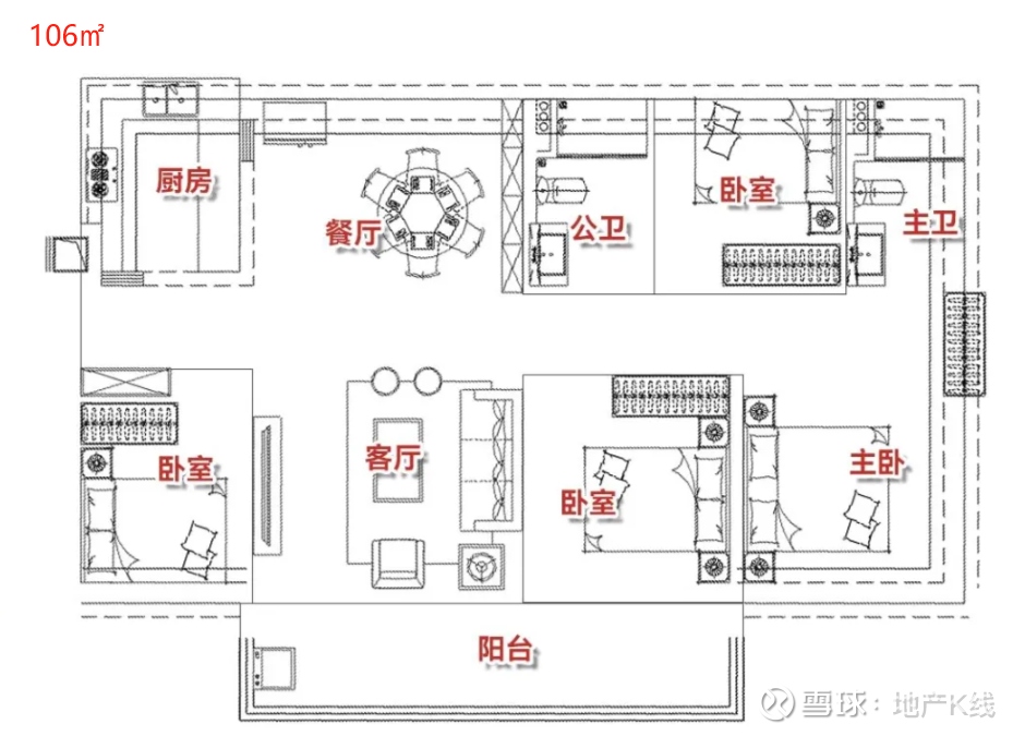 106㎡户型,四房两卫;相比前面户型,卧室空间相对大了一些。
