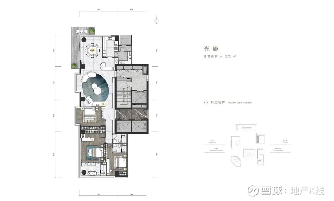 其中,270㎡是3室2厅3卫,北边餐厅外有270度大露台;南面主次卧套房;但公卫在南面起居室,缺乏隐私性。
