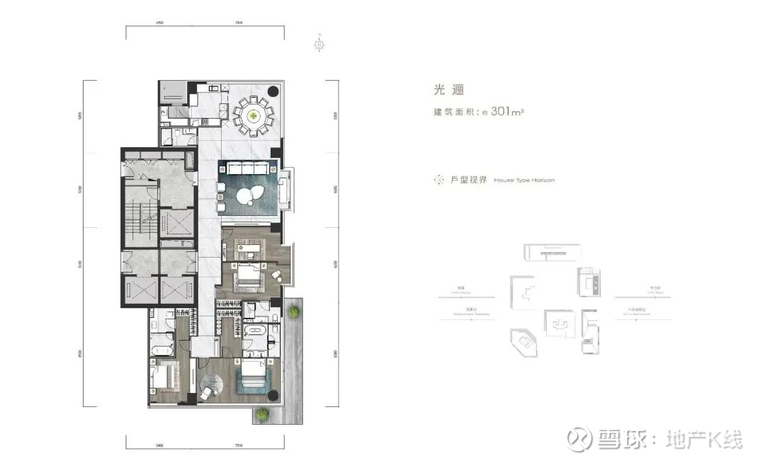 301㎡是4室2厅4卫,南面主卧外有270度大露台;但客厅面积比餐厅略小。