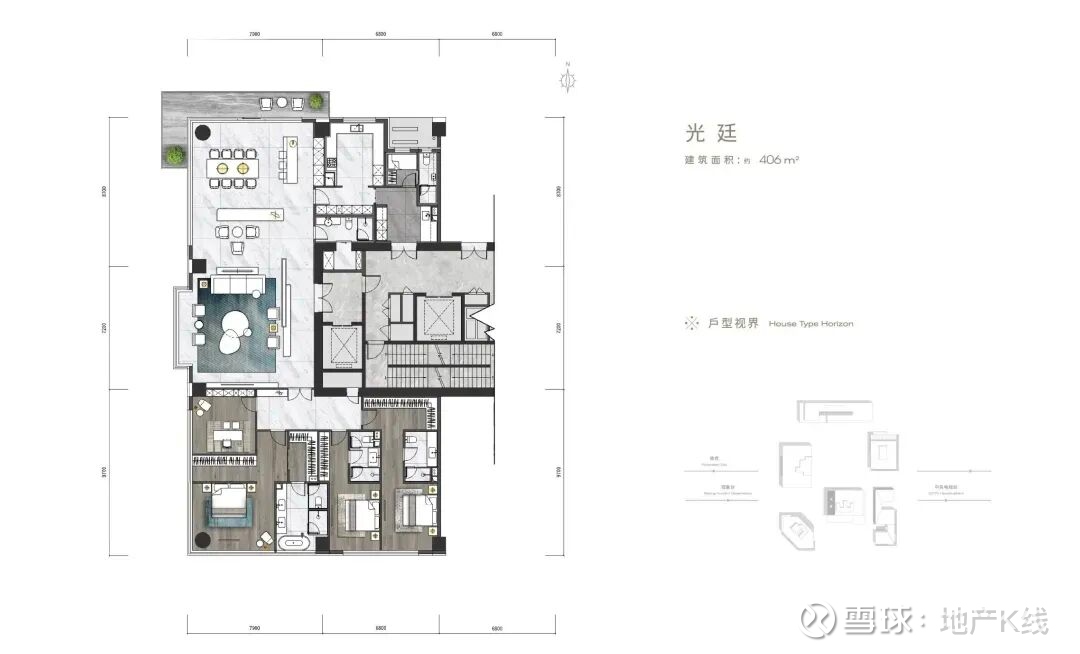 406㎡户型,125平米的餐客厅,15.9米超大面宽与270度1.5米宽的大露台,保姆有独立卫生间和电梯。
