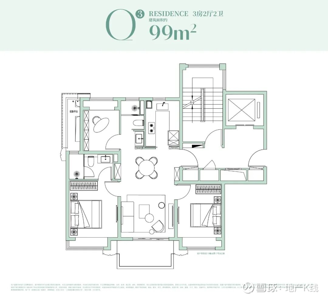 99㎡三房两卫:一梯两户,三开间朝南,经典飞机户型,阳台连客厅,双卧室带飘窗,客卫干湿分离,室内没有浪费空间,整体中规中矩。