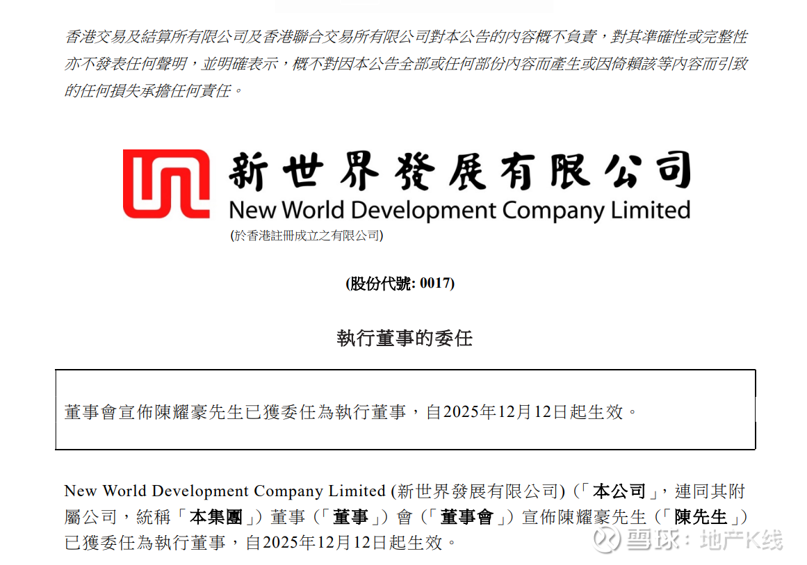 乐居财经 赵盼盼 12月11日,新世界发展有限公司发布公告称,陈耀豪已获委任为执行董事,自2025年12月12日起生效。
