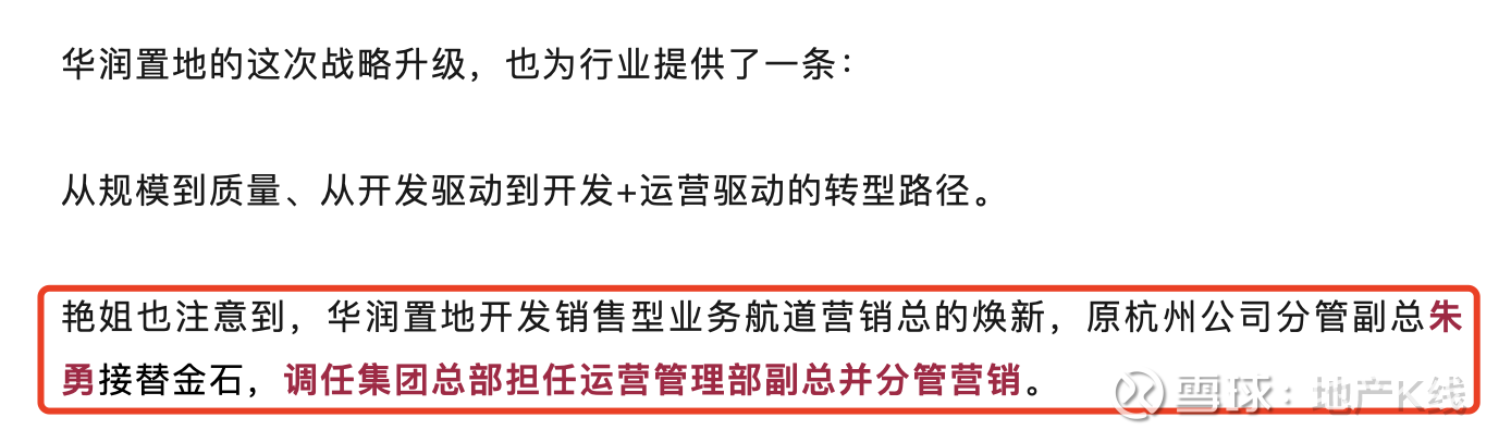 值得关注的是,报道中指出,华润置地开发销售型业务航道营销总的焕新,原杭州公司副总朱勇接替金石,调任集团总部担任运营管理部副总并分管营销。