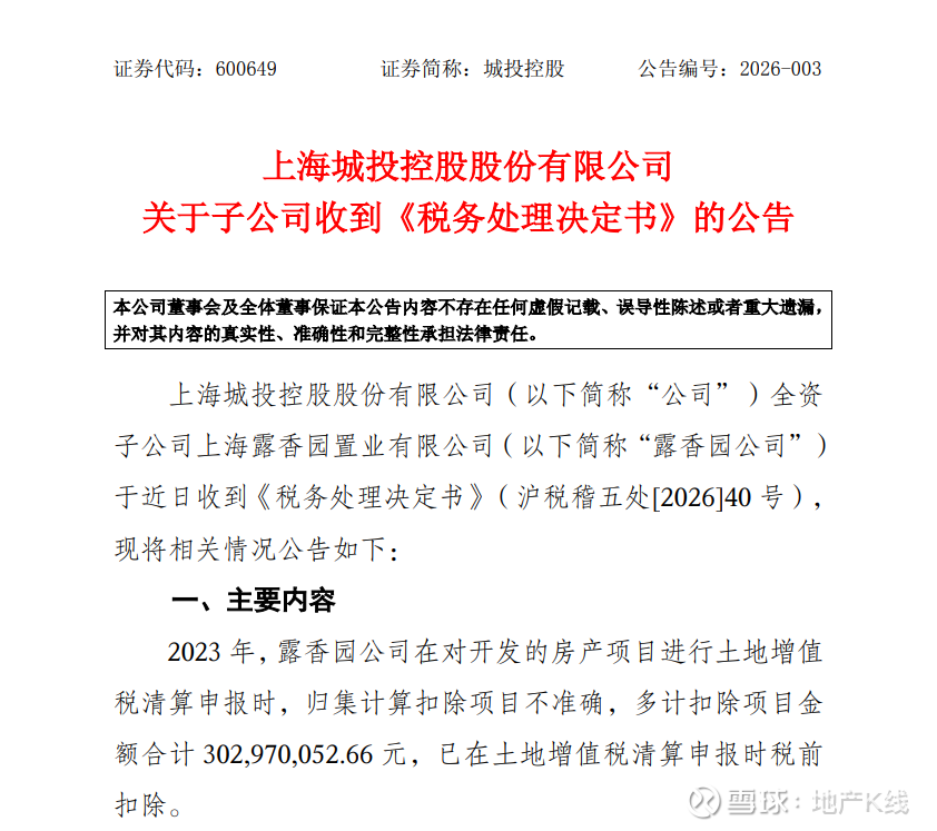 公告显示,2023年,露香园公司在对开发的房产项目进行土地增值税清算申报时,归集计算扣除项目不准确,多计扣除项目金额合计3.03亿元,已在土地增值税清算申报时税前扣除。