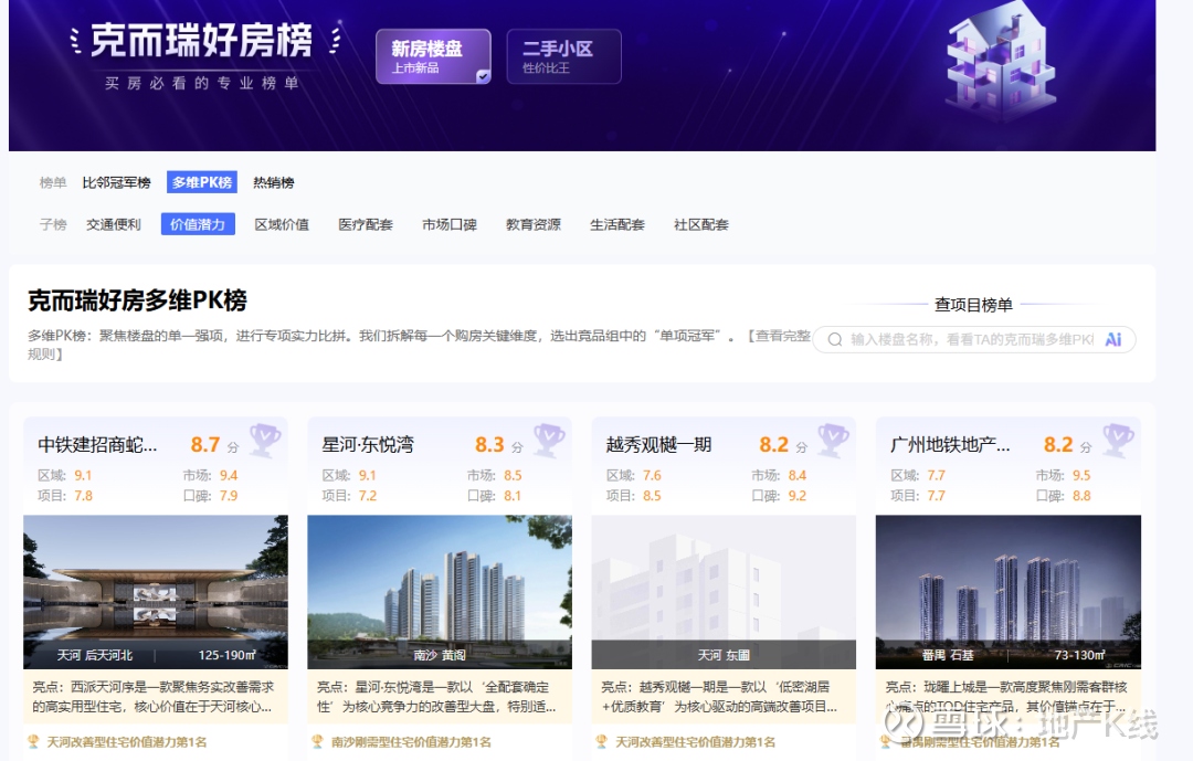 值得一提的是,如果你对二手房没想法,只想买有价值潜力的新房的话,可登录克而瑞·好房点评网-多维PK榜·价值潜力榜查看更多好房。