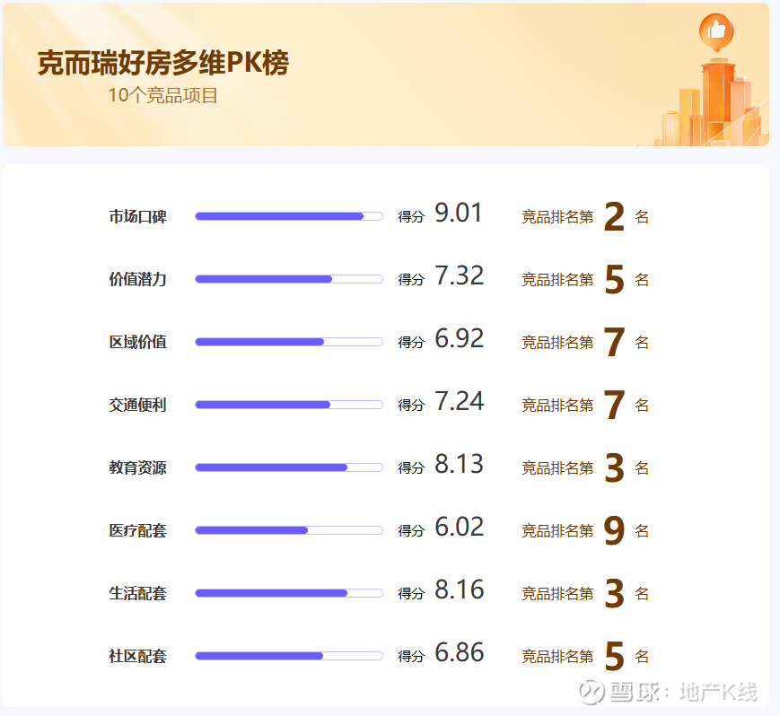 "多维PK榜"是克而瑞好房点评网基于克而瑞20年房地产行业的专业力和深度智联AI工程力,打造的新房项目专业评价体系。它以"相邻对标"为核心逻辑,在定位与地段相近的楼盘之间展开综合较量,甄选出单项维度测评的“特长生”,旨在为购房者提供客观、中立、高效的决策参考。