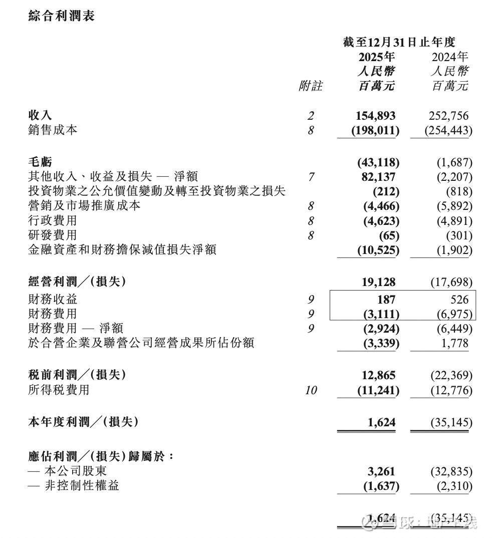 2025年,碧桂园实现总收入约为1548.9亿元,同比减少约38.7%;净利润约为16.2亿元,归属公司股东应占净利润约为32.6亿元,同比扭亏为盈。