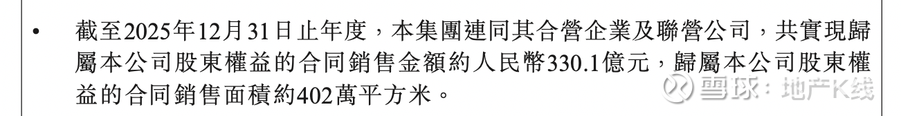 截至2025年12月31日止年度,集团连同其合营企业及联营公司,共实现归属公司股东权益的合同销售金额约330.1亿元,归属公司股东权益的合同销售面积约402万平方米。
