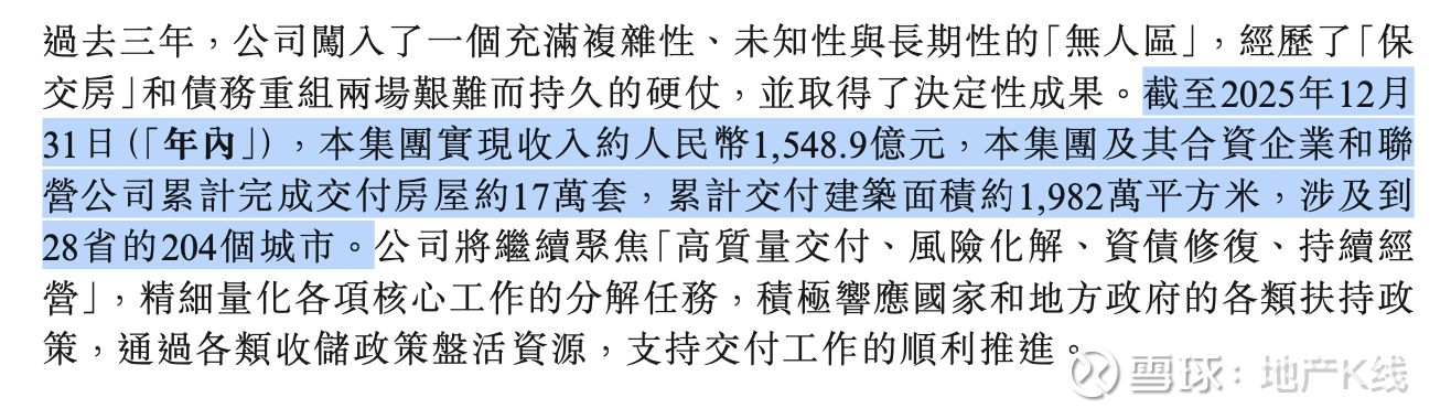 年内,集团及其合资企业和联营公司累计完成交付房屋约17万套,累计交付建筑面积约1,982万平方米,涉及到28省的204个城市。