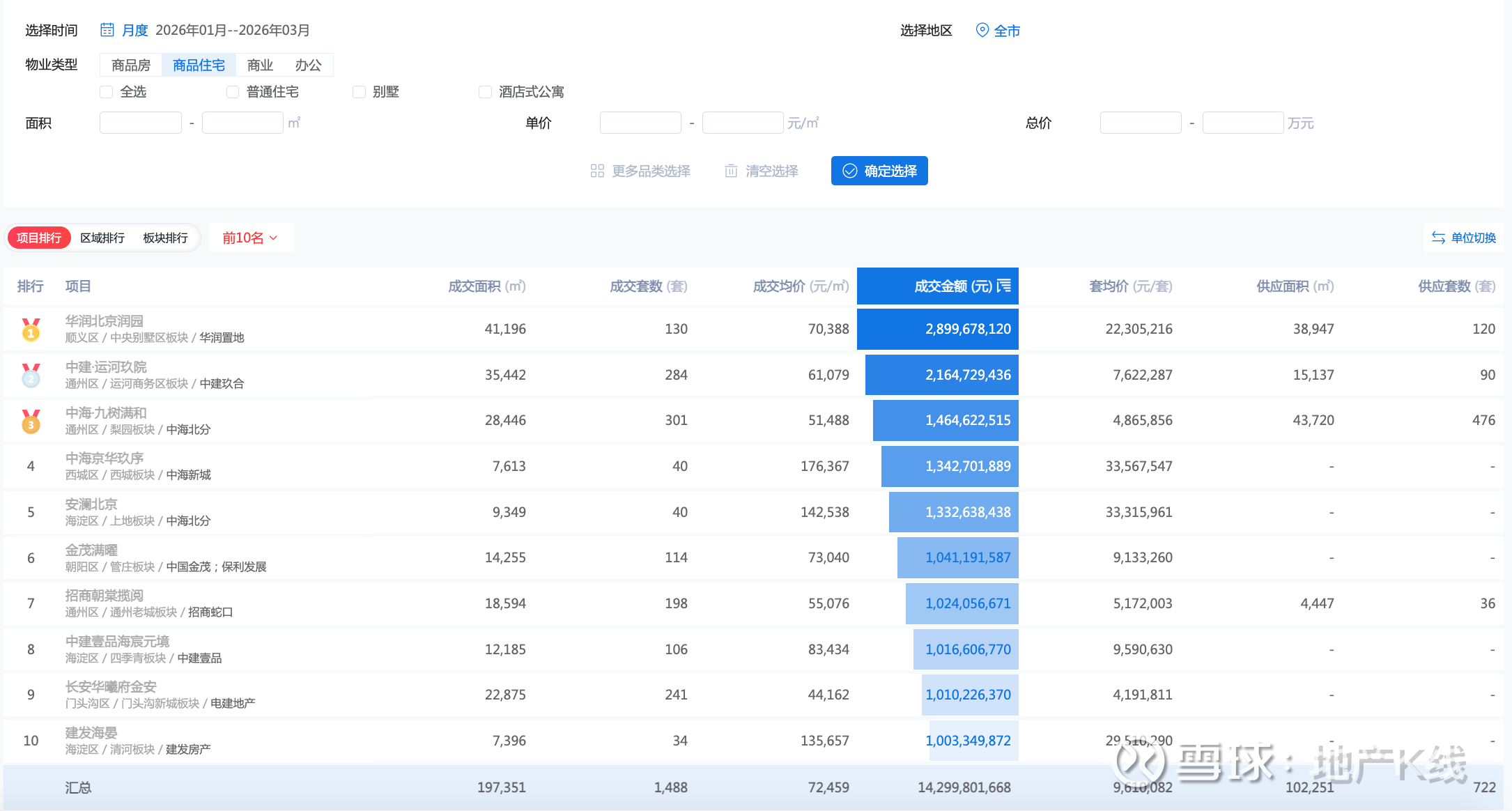 北京进深 徐迪2026年一季度北京住宅成交金额榜出炉。