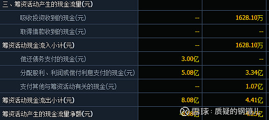 筹资活动产生的现金流量净额减少4亿,其中还债、分配股利同比增加5亿。