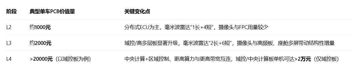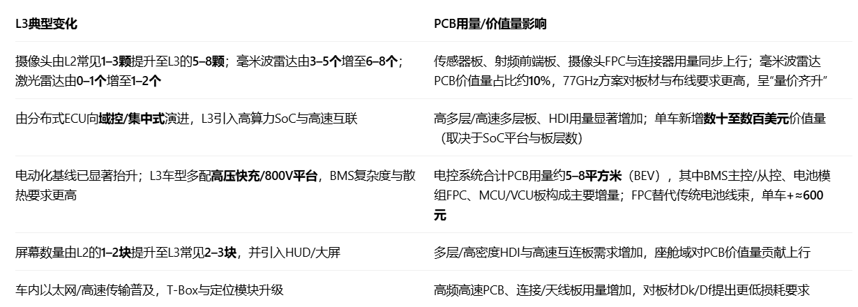 L3将显著抬升单车PCB用量与价值量,核心来自“传感器数量增加、域控/中央计算引入、高速互连与高频材料升级、以及电控系统FPC化”。从行业基线看:传统燃油车单车PCB约0.6–1平方米、价值量约300–400元;纯电动车(BEV)平均为燃油车的5–6倍,L3及以上车型在此基础上随传感器与域控进一步增加。车用PCB中,4–8层板仍为主流,但HDI、射频/高频板、FPC占比持续提升,带动价值量结构性。