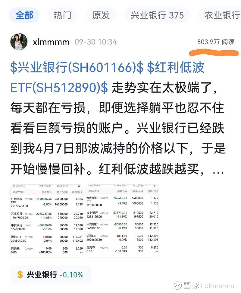 $兴业银行(SH601166)$ $红利低波ETF(SH512890)$ 节前最后一天发了个卖惨的帖子,阅读量居然高达500多万。自己被最近的行情教育清醒了,以前在股市赚了4000多万,不是因为自己水平高,仅仅是因为自己运气好而已!所以长假期间反而平和了,节后不管他股市怎么走了,双创就是涨上天我也不追不看了。现在的持仓兴业银行和红利低波ETF我也不管他了,反正养老足够了。我不看股市不就行了嘛,每天把网格自动单挂好,该上班上班就好了。其实我对于双创看法还是和节前一样,历史新高肯定要突破的。就是希望今后的行情不要这么极端了,双创新高之后,迎来股市普涨吧。祝大家发财!