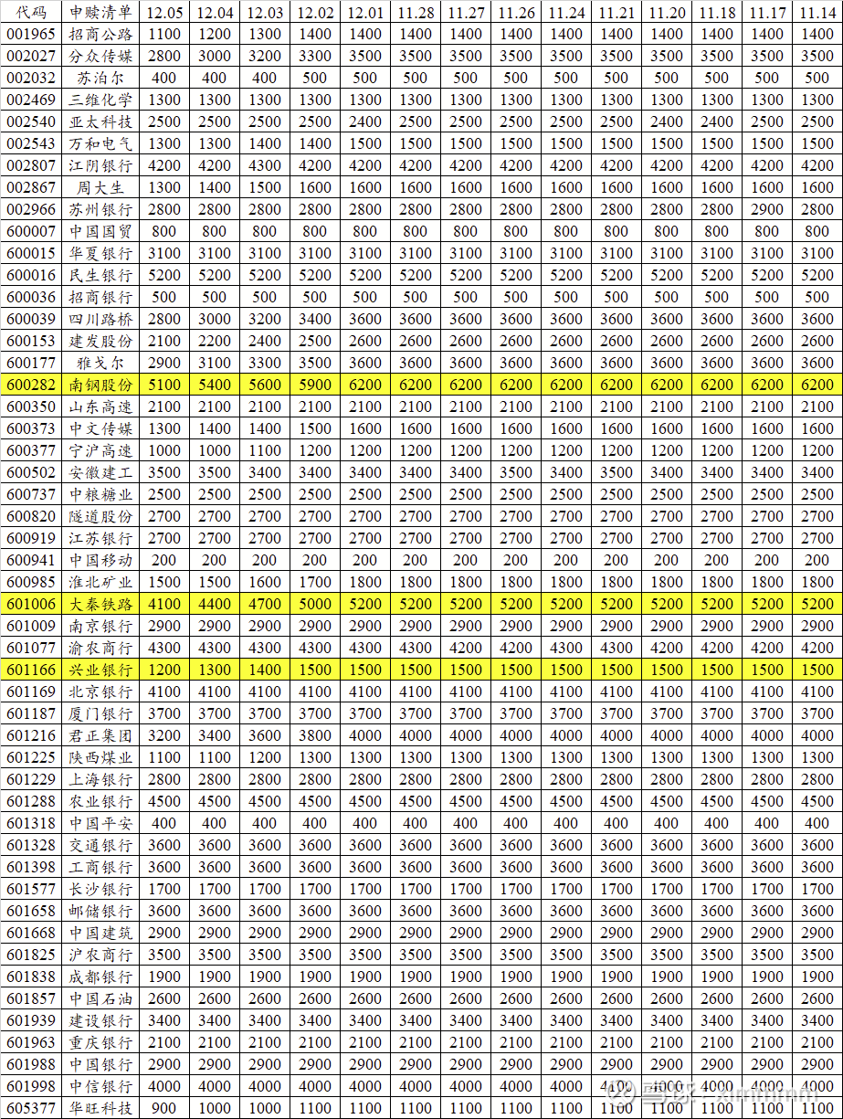 【5. 红利低波ETF上周卖了多少兴业银行?】先用南钢股份为例来算下,为啥选南钢股份呢,单纯就是因为其在申赎清单中的股份数量多,计算误差小。上周红利低波ETF的场内份额平均大概213亿份,南钢股份在11月28日的申赎权重大概是2.85%,因此持仓市值大概是213x1.20x2.85%=7.28亿元,除以上周均价5.4元,大概持仓7.28/5.4=1.35亿股。经过上周的连续5天卖出,其申赎清单份额从6200下降到5100,于是大概相对于卖出了(6200-5100)/6200x1.35=2400万股,平均每天大概卖出了480万股。