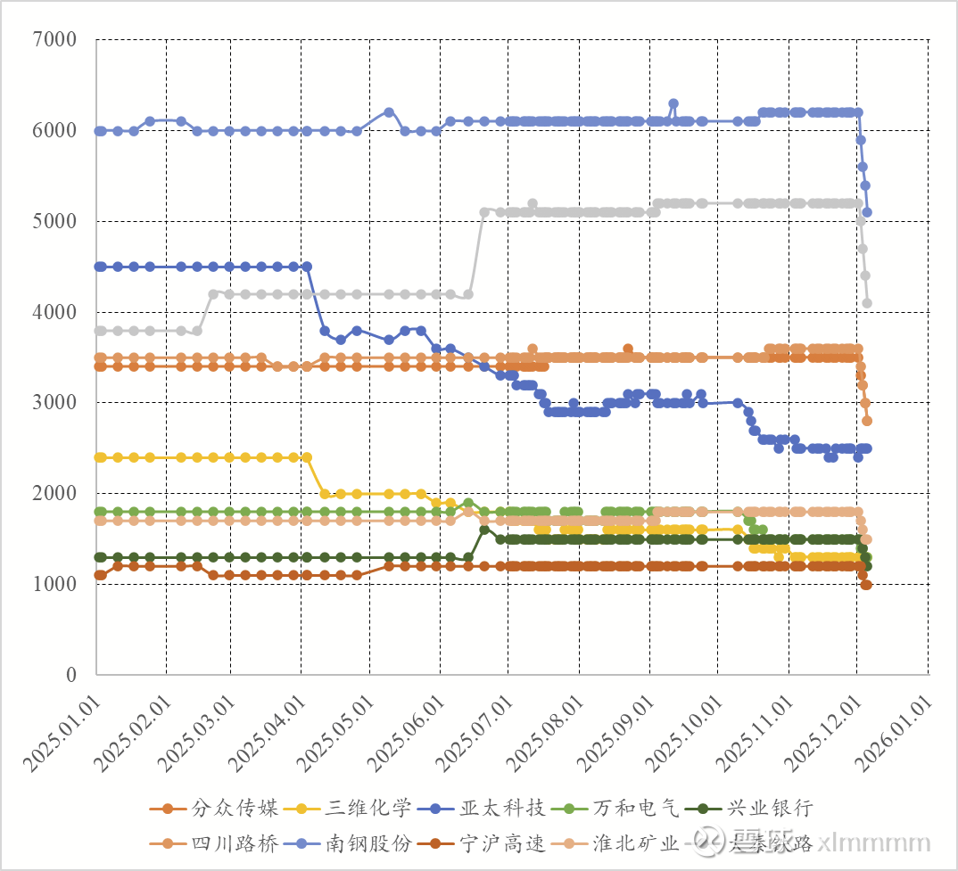 【4. 红利低波ETF的调仓路径】有了上述准备知识,就可以分析其调仓路径了。我每天都记录申赎清单的,详见下表,然后这个表格可以做成一个随时间变化的图,也截图如下。从图表可以清晰的看到,从本周一开始,红利低波ETF就已经开始在逐步减持调出股了。以股份数量最多的南钢股份为例,年初时其申赎份额为6000股,后来逐步微调到6200股,然后本周每天降低200~300股,到周五变成了5100股,大概卖掉了18%的仓位。