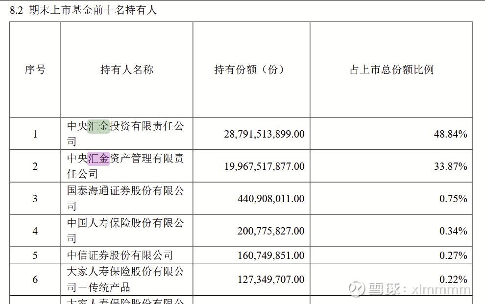 【3. 汇金持仓份额Line30~Line36】这些数据全部取自各ETF的年报和半年报。以上证50ETF为例,其2025年半年报中列出了前十大持有人,其中中央汇金投资责任有限公司持有287.915亿份,中央汇金资产管理有限责任公司持有199.675亿份,二者都是汇金,合计487.59亿份。我把两市规模较大的主要宽基ETF的半年报和年报都翻一下,大概找到了汇金有巨额持仓的9只ETF,分别是510050,510300,510310,510330,159919,510500,159845,159915,588080。可能还有其他的宽基ETF我没有统计进去的,欢迎各位批评指正。