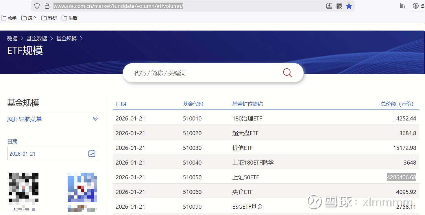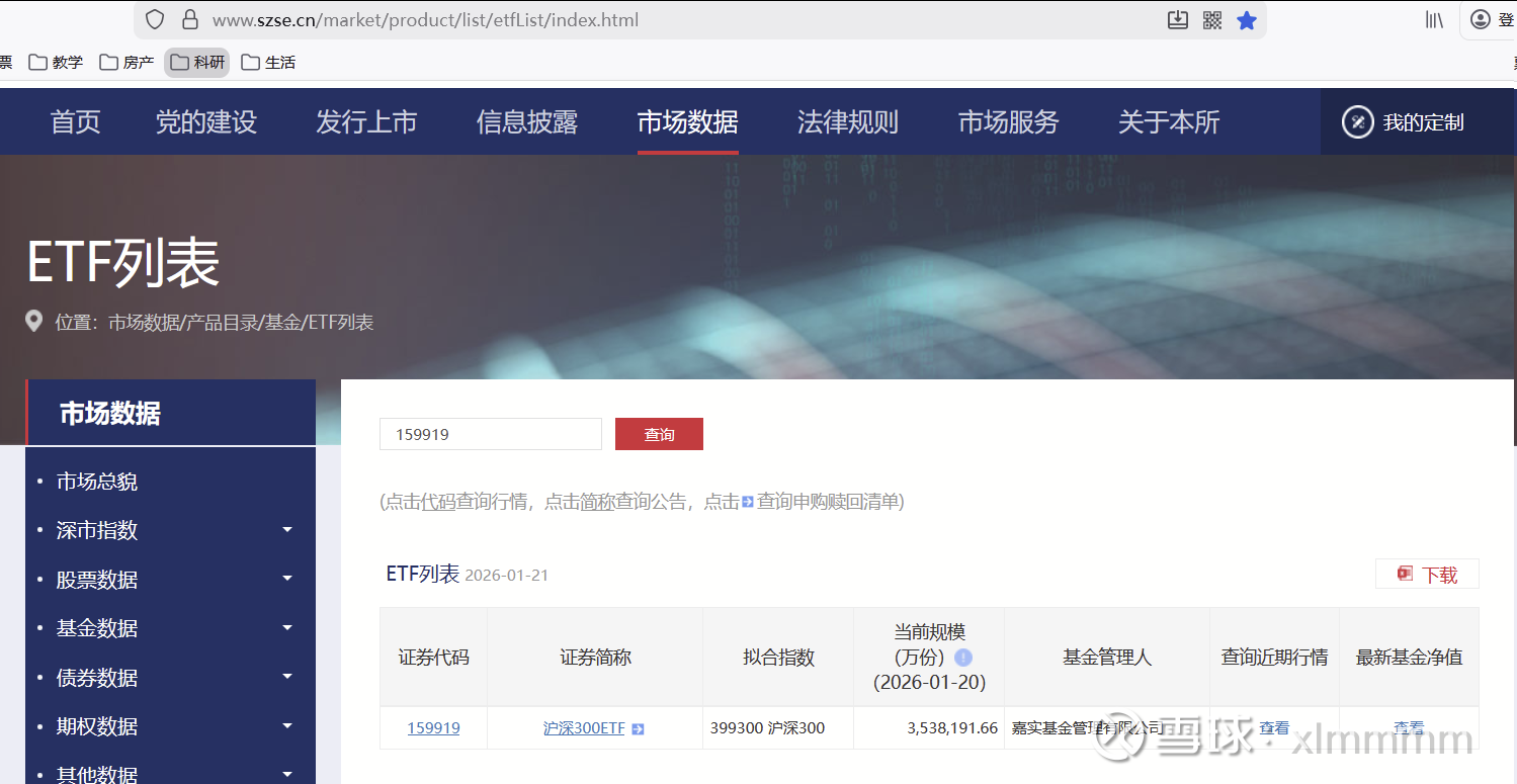 【5. 宽基ETF的规模和份额Line16~Line27】上交所和深交所每天都会公布所有ETF的当日份额,比如上证50ETF可以到官网查询截图如下网页链接,刚刚公布1月21日晚的份额为428.64亿份,1月14日晚的份额为558.33亿份,那么这5个交易日就减少了558.33-428.64=129.69亿份,上交所的ETF数据每晚22点10分前后准时公布。深交所的查询页面做得比上交所差很多,难看而且不能查询历史数据,只能查当天的,公布时间还是次日早间,反正我对深交所这个数据的意见老大了。查询链接如下网页链接。比如查询159919可知其1月20日晚间的份额为353.82亿份。今晚这帖子也等不到深交所明天公布1月21日的数据了,只好大概估算填一个