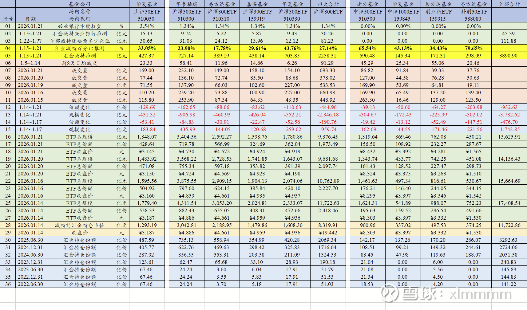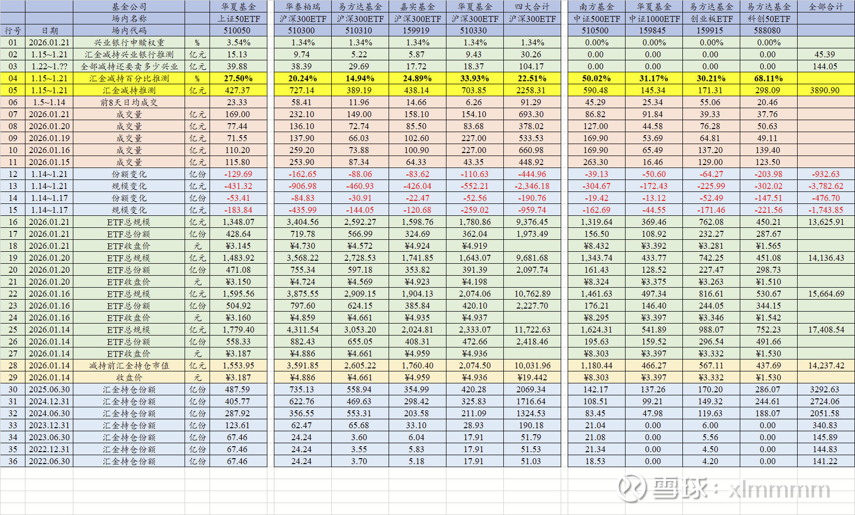 【6. 宽基ETF的规模和份额变化量Line12~Line15】知道了宽基ETF的份额变化,就可以算出汇金减持这5天来,ETF总变化是多少。还是以上证50ETF为例,1月14日总份额558.33亿份/总规模1779.40亿元,而1月21日晚间总份额428.64亿份/总规模1348.07亿元。于是上证50ETF这5天份额累计净赎回了558.33-428.64=129.69亿份,总规模减少了1779.40-1348.07=431亿元。同理,可以算出四只沪深300ETF份额累计减少了445亿份,总规模减少了2346亿元。这9只ETF全部加起来,份额总共减少了932亿份,市值总共减少了3780亿元。