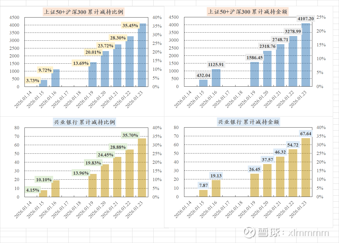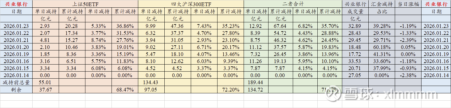 【4】把汇金持仓的上证50和沪深300换算成兴业银行,这7个交易日大概也是同步卖出了67亿,大概占其持仓的35.7%。总有人不断问汇金卖了这么多,到底谁接盘了。今天干脆再解释下,汇金场内砸出ETF造成瞬时折价,套利机器人接盘之后把ETF转换为一篮子成分股,然后把这些成分股卖给股民。这个操作在零点几秒就能自动完成。所以其实汇金卖出的4100亿,都被成分股的买盘消化了。具体到兴业银行,汇金总共67亿抛盘,两周的融资净余额增加12亿,大概承接了18%,其他肯定就是入场抄底的资金了。老登股们没有资金关注,承接不住这么大的短期抛盘,所以只好通过价格下跌达到平衡。成分股中的一些新贵,汇金这点抛盘分分钟就吃掉,所以对价格影响不算大。周五汇金抛了12.92亿兴业银行,股价下跌1.19%,当日总成交32.89亿元,汇金抛盘就占39%。这要是换成中际旭创,人家一天成交量就是230亿,汇金这一天10多亿的抛盘进去也就是打个水花而已,对盘面起不到决定性作用。