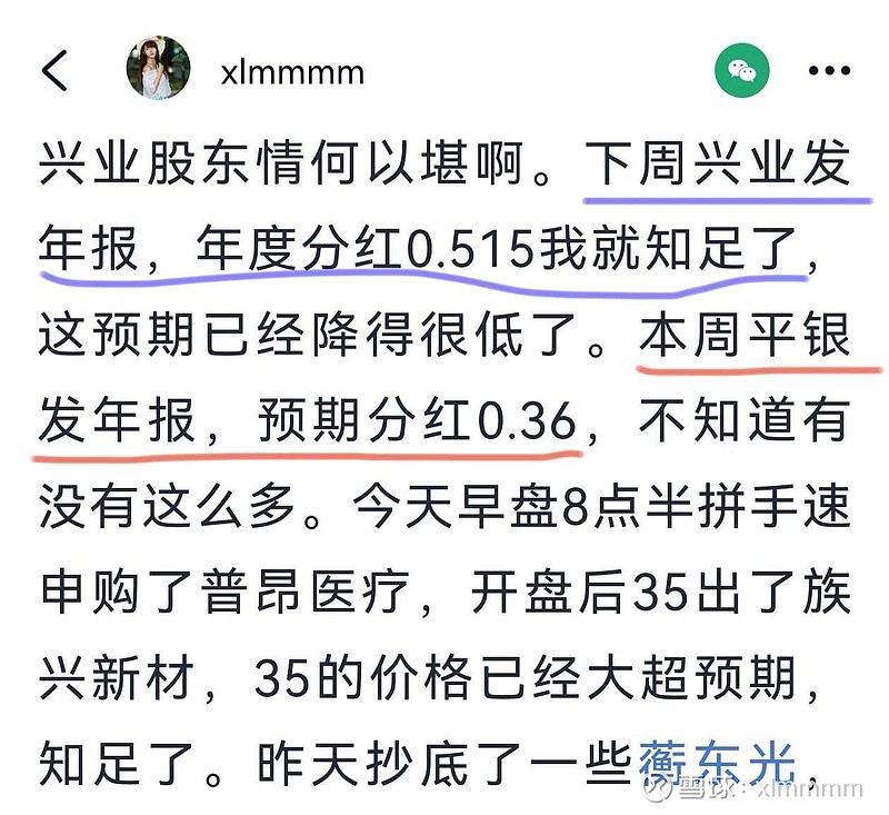 。都怪自己手贱,还好仓位占比不算大。懒得去仔细看年报了,大致扫了一眼,虽然营收降利润降拨备降,但应该不会倒闭,看在5.57%股息率的份上继续拿着当门票吧。希望平安银行早日迎来业绩反转吧。兴业银行是发过快报的,营收利润都是已知数据,因此下周年报看点就是分红。不过兴业年报发布之后还是打算仔细研读的,这好歹是我的第一重仓。期望分红0.515,加上中期分红0.565,年度分红就是1.08,静态股息率1.08/18.78=5.75%。要求真的不算高,希望管理层能看到。祝大家发财!
