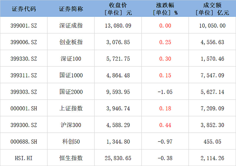 截至收盘,深证成指(399001)涨0.00%,创业板指(399006)涨0.25%,深证100(399330)涨0.30%;市场全天成交额超1.7万亿元。