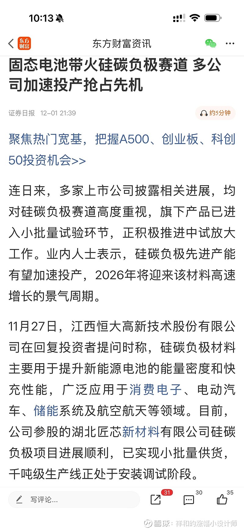 11月27日,江西恒大高新技术股份有限公司在回复投资者提问时称,硅碳负极材料主要用于提升新能源电池的能量密度和快充性能,广泛应用于消费电子、电动汽车、储能系统及航空航天等领域。目前,公司参股的湖北匠芯新材料有限公司硅碳负极项目进展顺利,已实现小批量供货,千吨级生产线正处于安装调试阶段。