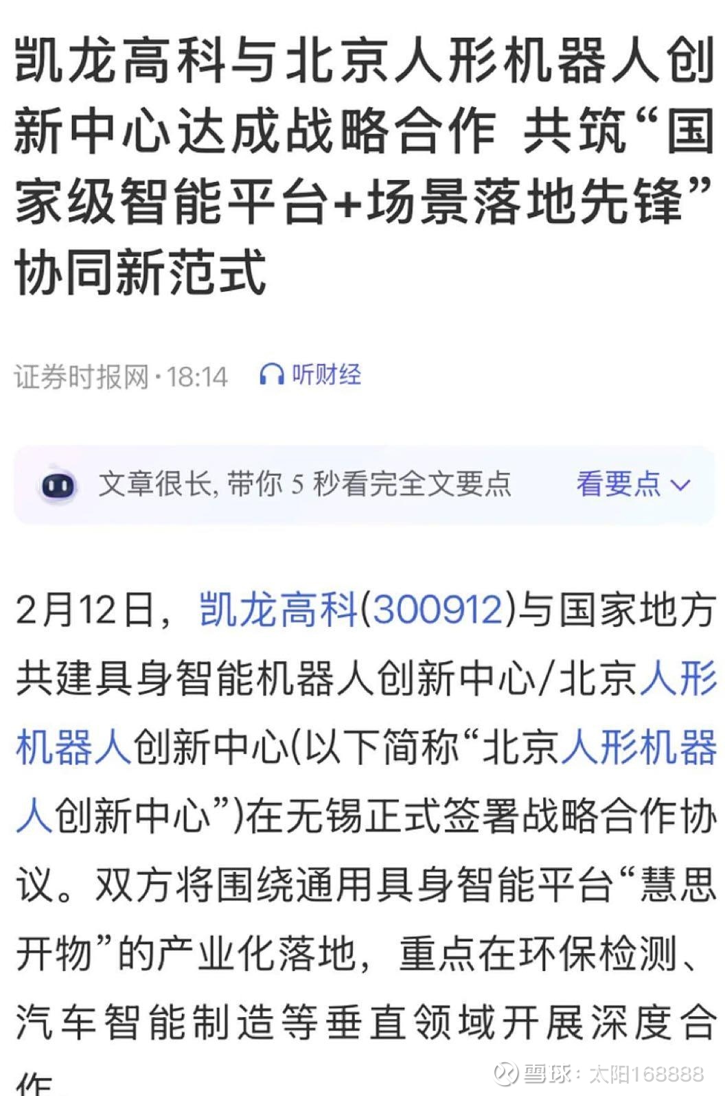 之前我说凯龙高科是无锡推出来的人形机器人,之前央视报道,现在直接合作国家忍不住出来说一下这个超级利好。现在有头部技术(机器人领域大佬丁汉院士站台,参加技世界机器人大赛,央视报道),有制作能力(收购金旺达,无锡机器人产业群),有落地场景(合作国家具身智能机器人)逻辑闭环了