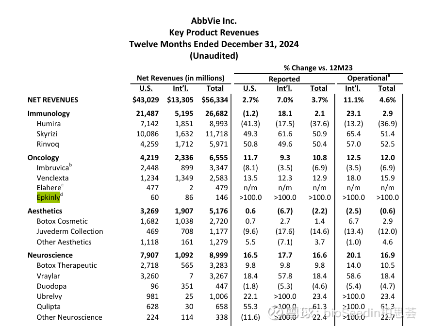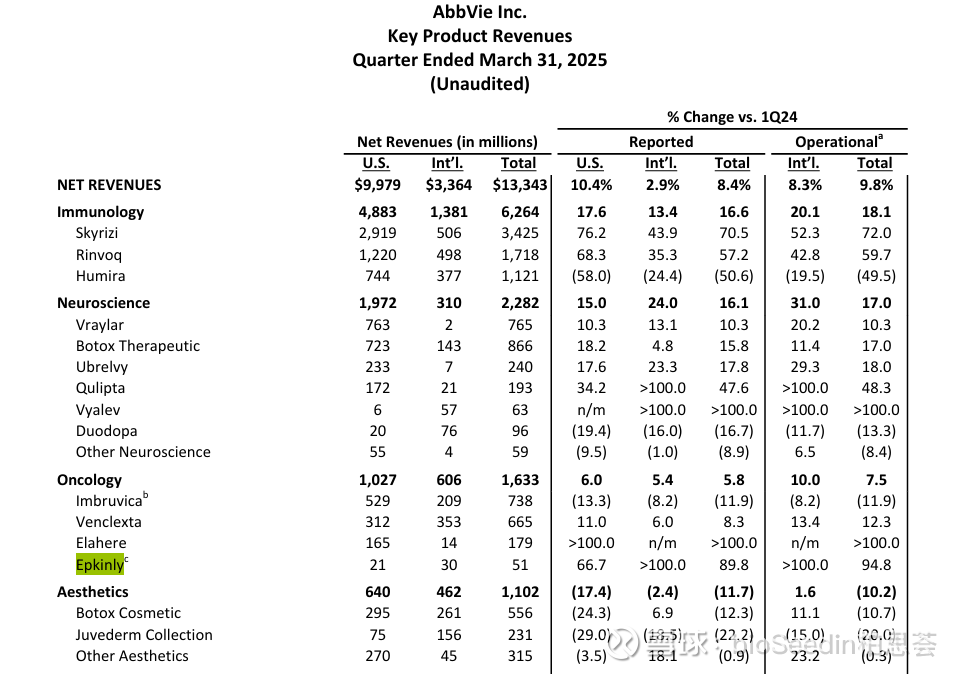 这款基于Genmab专有DuoBody技术构建的CD3/CD20双抗,已被行业媒体Evaluate列为“2023年十大潜在重磅疗法”之一。其销售表现也印证了这一预测:其2024年销售额已经达到了1.46亿美元,而2025年Q1财报显示,Epcoritamab销售为5100万美元,其中美国市场为2100万美元,国际市场为3000万美元,同比增长89.8%。未来预计年峰值销售额为12亿美元,有望进入重磅炸弹的门槛。