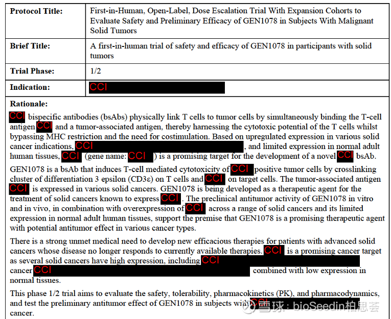 根据clinicaltrials.gov以及Eu clinical trials的注册资料显示,GEN1078源于Genmab与OmniAb的合作协议,是一款TCE双抗,但肿瘤靶点一直处于保密状态(文档中多次提及的肿瘤相关抗原,具体名称未明确,但强调其在多种实体瘤中高表达,正常组织中低表达)。