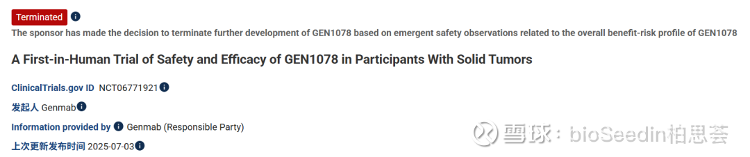 抗体药物领域龙头Genmab近日悄然更新了clinicaltrials.gov上一项试验记录:其早期T细胞衔接器(TCE)双抗项目GEN1078已被终止。