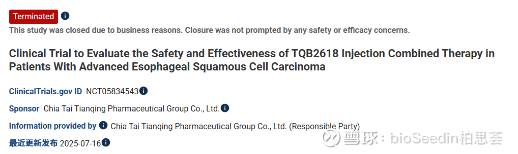 TQB2618是正大天晴开发的一款TIM-3单抗。根据ClinicalTrials官网信息来看,出于商业原因,在近期终止了TQB2618用于治疗晚期食管鳞状细胞癌的临床1/2期研究。