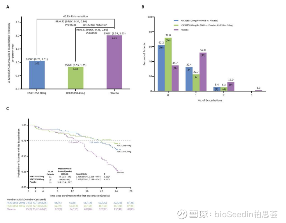 今年3月,国际顶刊《柳叶刀·呼吸医学》在线发表了HSK31858的II期临床研究成果。该研究由钟南山院士与关伟杰教授联合牵头。主要结果显示,与安慰剂组相比,20 mg HSK31858组(下降幅度为48%)和40 mg HSK31858组均显著降低急性加重发生频率(下降幅度达60%)。未发生急性加重的人数,HSK31858 20mg组和40mg组均显著多于安慰剂组。与安慰剂组相比,HSK31858 20 mg组和HSK31858 40 mg组至首次急性加重的平均持续时间均显著延长。